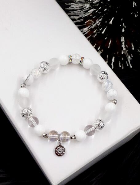 Gyönyörű ezüst hópehely medálos ásványkarkötő hófehér tejkvarc, matt és robbantott hegyikristály és ezüstre festett lávakő ásványokból.