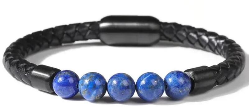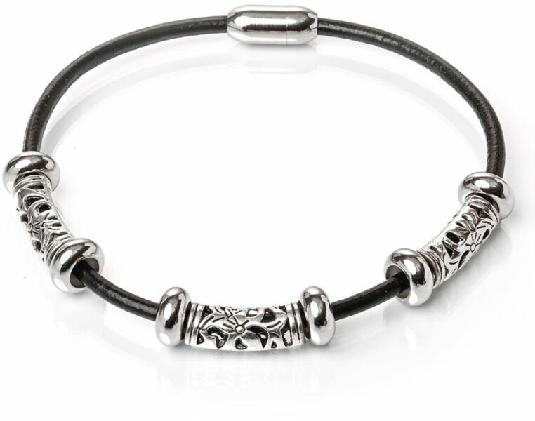 Mágnes záras bőr karkötő nemesacél és fém-ötvözet díszekkel. Karkötő bőr, méretét válaszd ki a listából vagy írd be megjegyzésbe.