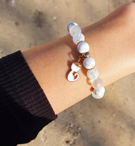 Gyönyörű cica medálos ásványkarkötő, hegyikristály, tejkvarc és howlit ásványokból készítve, arany díszítéssel.