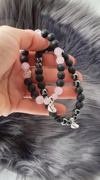 Gyönyörű egyedi szerelmi karkötőpár. A férfi karkötő fekete grafit szín hematitból és lávakőből készül, míg a női rózsakvarc ásványból és lávakőből. A karkötőket egy-egy aprócska, mindössze 6-8 mm átmérőjű szívecske medál díszít "Szeretlek" felirattal. Az ár egy pár (2db) karkötőre vonatkozik.