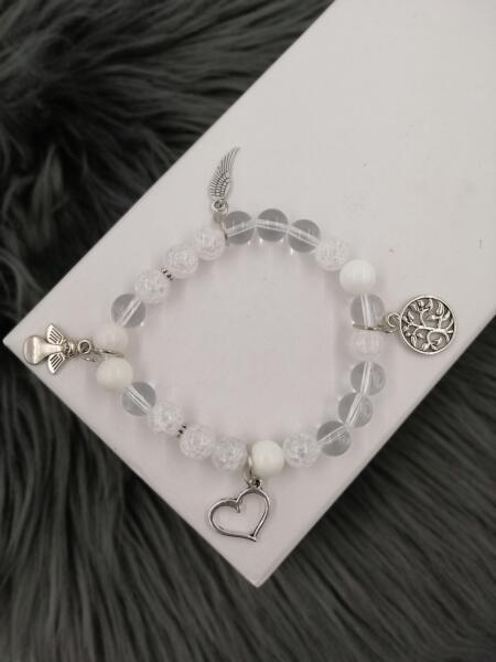 Gyönyörű egyedi ásványkarkötő tejkvarc, hegyikristály és robbantott hegyikristály ásványokkal, több strasszos díszítéssel, angyalka medállal díszítve.