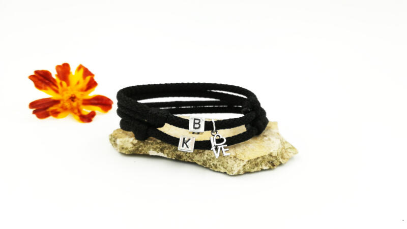 Ez az egyedi karkötő pár, fekete parakord zsinórból készültek, csomózásos technikával, a karkötő csúszócsomókkal van ellátva, mellyel be lehet állítani a méretet felvételkor. A női karkötőn apró "LOVE" feliratú medál található. A karkötőn pontos precíz eldolgozások vannak, gyönyörű, hibátlan tökéletes darabot fogsz kézhez kapni! A betűket egyedileg rendelhet