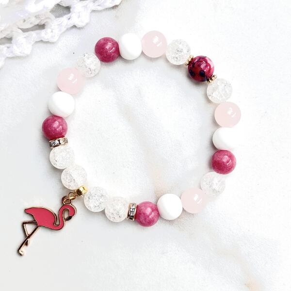 Gyönyörű Flamingó medálos ásványkarkötő, hegyikristály, tejkvarc, rózsakvarc, pink jáspis ásványokból készítve, arany díszítéssel.