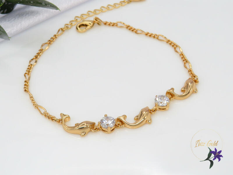 Antiallergén delfines karkötő fehér cirkóna kövekkel Szin: 18K Méret: 18+4 cm /2-8mm A forgalmazott divatékszerek alapanyaga nikkel és ólommentes ezért többnyire nem okoznak allergiás tüneteket, nyugodtan hordhatják fémérzékeny emberek is. Általában nem színezik a bőrt és más divatékszerekhez képest nagyságrendekkel jobb kopásállósággal rendelkeznek. A fehér (ezüst