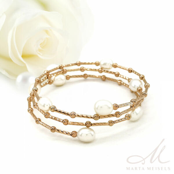 Elegáns stílusú, finom kidolgozású spirál alakban tekert rozé arany színű menyasszonyi karkötő, melyet édesvízi tenyésztett gyöngyök díszítenek. Méretre állítható, hogy tökéletesen illeszkedjen a csuklóhoz. Különleges és elegáns valódi gyöngyös karkötő, melyet rozé arany kiegészítőkhöz ajánlunk menyasszonyoknak, koszorúslányoknak. Elegáns, finom sítlusú