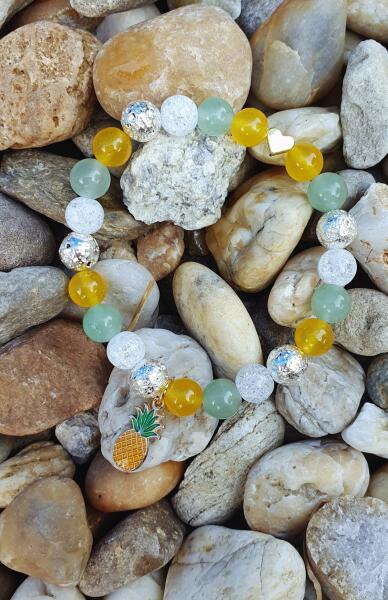 Álomszép ásványkarkötő ananász medállal, mely gyönyörű csiszolt aventurin, citrin, hegyikristály és festett lávakő ásványokból készült, arany szín medállal díszítve.