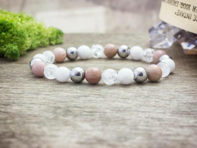 Jáde, rodokrozit, hematit és roppantott hegyikristály ásványokból fűzött gumis karkötő. Amit a jádéról érdemes tudnod: A Jáde egy gyűjtőcsoportja a kövek egy fajtájának. Lelki gyógyhatása: Több örömmel és életkedvvel ajándékoz meg minket. Növeli a bennünk lévő szeretetet, a harmónia iránti igényünket. Testi gyógyhatás: Szabályozza a szervezet sav-bázis egye