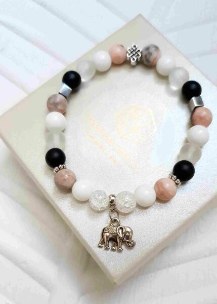 A karkötő egyedi tervezésű, mely rose zebra jáspis, hegyikristály, tejkvarc, robbantott hegyikristály, hematit, és matt ónix ásványokból készült ezüst díszítéssel, elefánt és végtelen csomó medállal.