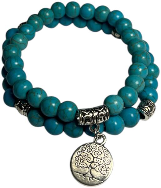 Élet fája női karkötő Ez a különleges, kétsoros karkötő természetes türkiz gyöngyökből készült, melyek 8 mm-es méretükkel impozáns megjelenést biztosítanak. A karkötő központi dísze az Élet Fája medál, amely a növekedést, az erőt és az összetartozást szimbolizálja. A türkiz gyöngyök nyugtató színe és az Élet Fája motívum harmóniát és békét sugároz