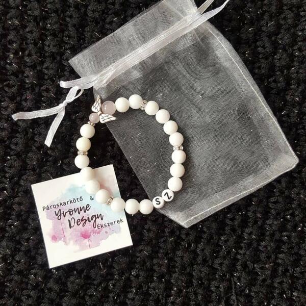 Gyönyörű egyedi karkötő fehér tejkvarc és rózsakvarc ásványokból strasszos díszítésekkel illetve egy betűgyönggyel.