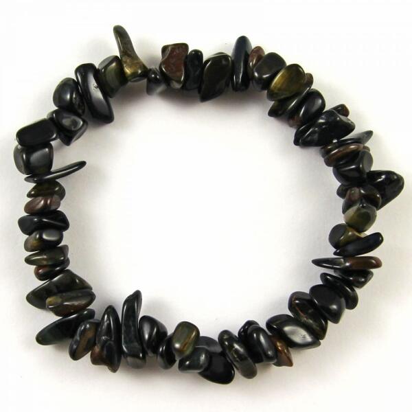 Sólyomszem ásványból készült szemcsés ( splitter vagy chips néven ismert) karkötő. A karkötőből gumis vagy kapcsos rendelhető. A kapcsos karkötő strapabíró acél sodronyra van fűzve, ezüstözött, nikkel mentes fém részekkel van szerelve, delfin kapoccsal záródik. Hossza: 18-23cm közt lánchosszabbítóval állítható. A gumis karkötő szilikon gumira fűzött, kapocs n