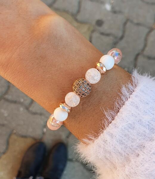 Yvonne Design rosegold luxury ásványkarkötő. Gyönyörű csillogó prémium minőségű pasztell ásványkarkötő, mely rose zebrajáspis, tenyésztett igazgyöngy, hegyikristály, tejkvarc és aurakvarc ásványokból készült, luxury rosegold díszítéssel.