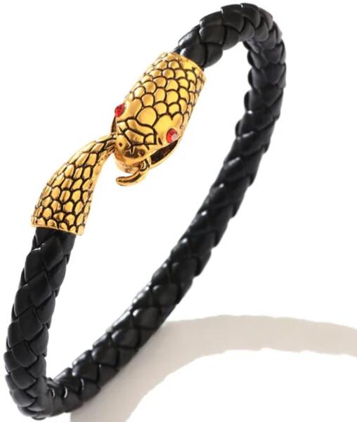 Schlange karkötő A kígyó motívummal díszített feltűnő karkötő a hatalom, erő és bátorság tökéletes szimbóluma. Kiváló minőségű fekete fonott bőrből készült, a karkötő a hagyományos kézműves feldolgozást modern dizájnnal ötvözi. A részletesen kidolgozott pikkelyekkel és piros szemekkel rendelkező kígyó drámai megjelenést kölcsönöz a karkötőnek, amely
