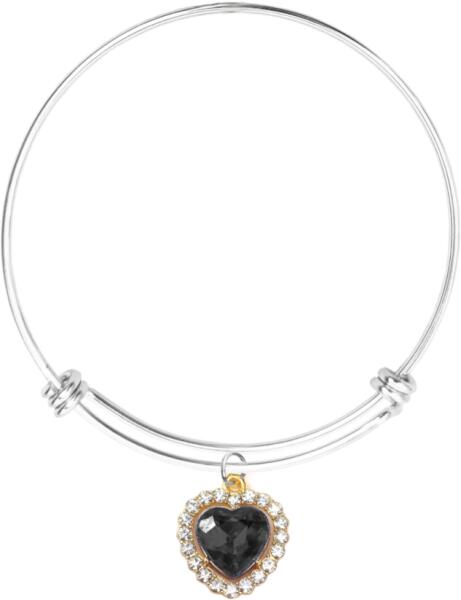 Átmérője 6 cm. Valamelyest rugalmasan felvehető, nem nyitható, tehát a kézfej is átbújik a karperecen. Kb. 17-18 cm-es körméretű csuklóig ajánlott. Fekete kristály szív ezüst színű karperecen. Paraméterek:Medál / mérete kb. 1,5 cm. Medál anyaga fém ötvözet. Karperec anyaga rozsdamentes acél.