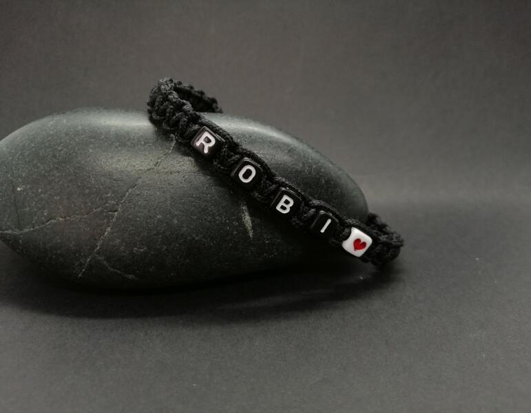 Teljesen egyedi, szabadon választható névvel ellátott karkötő, mely vékony parakord zsinórból font fekete betűkkel és egy szívvel a név után. A nevet, amit a karkötőn szeretnél látni, a vásárlás végén a megjegyzés rovatban add meg nekünk, ami max 7 karakterből állhat + a szív.