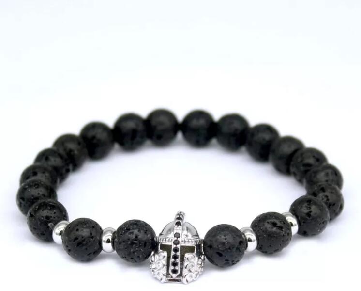 Ez egy gyönyörű egyedi tervezésű LUXURY férfi karkötő, 8mm átmérőjű gyöngyökből készült fekete lávakő ásványokból, és mikrokristályos gladiátor medál díszíti.
