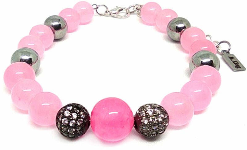 Figyelem! Nem szakad, nem nyúlik! Tartós ékszer. Kérheted csat nélküli rugalmas gumidamilra is. Amennyiben rugalmas damilra kéred, Megjegyzésbe írd be rendeléskor, hogy csat helyett rugalmas gumidamilt kérsz, és a csuklód körbemért méretét is írd meg. Az ékszer ásványai és tartozékai: – 10 és 8 mm-es pink Jade ásványok – 8 mm-es strasszos pavé charmok – 8 mm-es