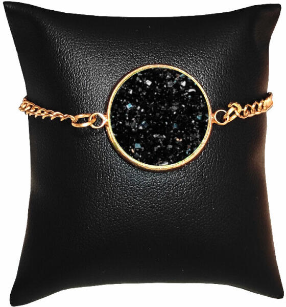 Fekete csillámos karkötő, ezüst színben. Paraméterek : A medál alapja fém, rajta a csillámos gyanta 20 mm-es. Fémrészek anyaga rozsdamentes acél. – Karkötő hossza 17+5 cm. Ez a termék rendelésre készül, ezért a szállítási idő 3 nap.