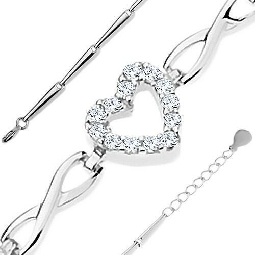 925 ezüst karkötő fényes vékony elemekkel, mely egyik vége enyhén szélesedik. A díszített részt három szívkörvonal alkot csillogó átlátszó cirkóniás felszínnel. A szívek infinití szimbólumú elemekkel vannak összekapcsolva. Állítható hossz, delfinkapocs. A díszített rész méretei: 50 x 9 mmA karkötő szélessége: 2 mmA karkötő hossza: 170 mmA hosszabbító lánc: