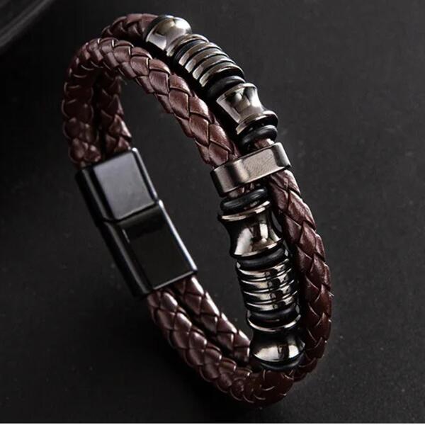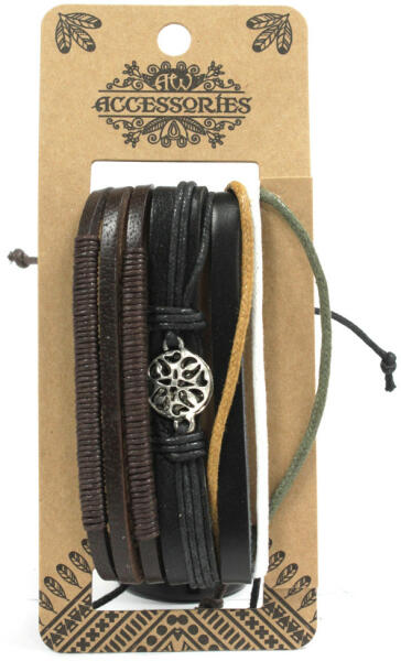 Ryan Karkötő Különleges Ryan karkötő uraknak verhetetlen áron. Ezzel a karkötővel szépen kiegészítheti öltözékét. Az ékszer nem tartalmaz sem nikkelt, sem ólmot, sem kadmiumot, ezért érzékeny bőrű emberek is viselhetik. Tulajdonságok: A karkötő hossza: 20cm Anyaga: Öko bőr/Nemesacél Szín: Barna/Fekete