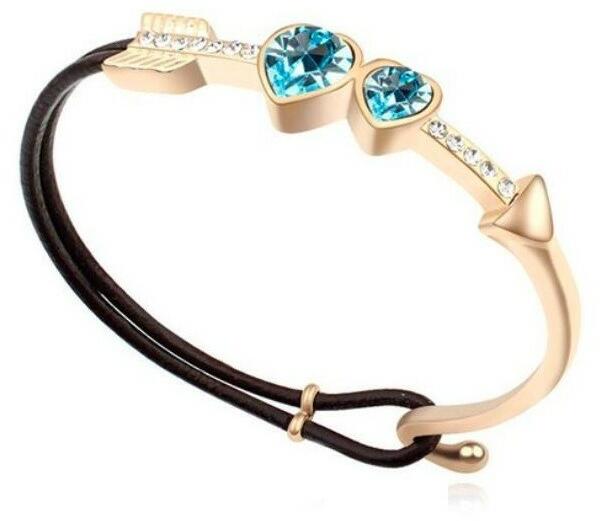 Cikkszám: 0048 Akasztós karperec: - türkizkék színű Swarovski kristályos díszítéssel, - arany bevonattal, - barna színű bőrszíjjal. Belső átmérők: 5,8 cm és 4,8 cm. (Max. 16,5 cm-es csuklóra jó!) Súlya: 11 g. Alapanyaga: minőségi fémötvözet. Gyönyörű, Swarovski kristályos, exkluzív ékszer! A megadott méreteket kérjük vegyék figyelembe!