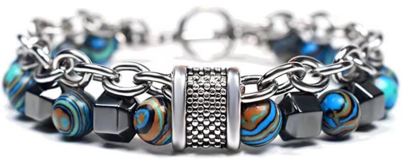 Gabor karkötő Mutatós karkötő színes gyöngyökkel és robusztus fém láncokkal, amely tökéletes kiegészítő azok számára, akik szeretik az egyedi és modern stílust. A fém részletek eleganciát adnak a karkötőnek, míg robusztus felépítése hosszú élettartamot és kényelmes viseletet garantál. Ez a karkötő ideális mindennapi viseletre és különleges alkalmakra, amikor