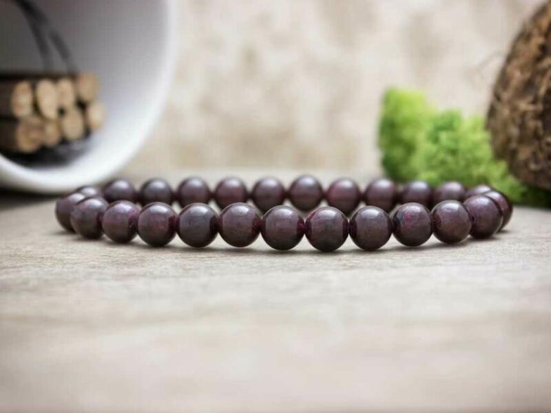 Gránát ásvány gyöngyök gumira fűzve. Amit a gránátról tudnod érdemes: A gránát mély, sötétbordó színe a gránátalma gyümölcsének a színére emlékeztet; a neve is innen jött. A görög mitológiában a gránátot gyakran adták egymásnak a szenvedély ajándékaként és megfelelt a örök szerelem szimbólumának. A középkorban a mérgezés elleni óvintézkedések egyi