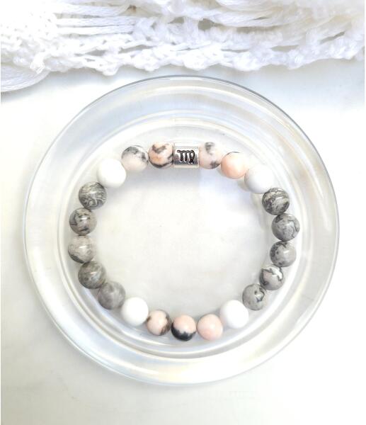 Yvonne Design horoszkópos ásványkarkötő a szűz ásványaiból készítve: jáspis és howlit a szűz csillagjegy jelképével. A szűz jegy jellemzése:A szűz elemző hajlamú, szinte röntgensugárral vizsgálja egy-egy kérdés valamennyi lehetséges megoldását, és legtöbbször megtalálja a legcélravezetőbb utakat. Mindent előre lát, hiszen előzetesen mindent rendszerez, osztál