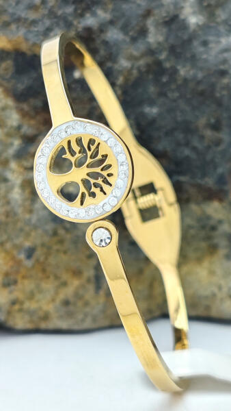 Aranyszínű nemesacél (316L) karperec, melyet életfa motívum díszít és fehér cirkónia kristályok tesznek csillogóvá. A karperec kinyitható ( rugós ) a könnyebb felhelyezés érdekében. Minőségi, tartós anyagának köszönhetően akár mindennapi viseletnek is alkalmas. Antiallergén ékszer. 14K arany színben kapható. Karperec szélessége: 3 mm. Életfa minta átmérője: 15