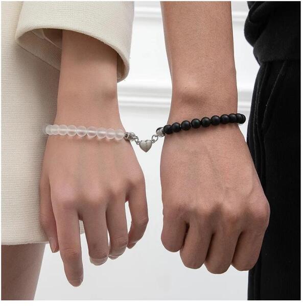 Csodálatosan szép szerelmi páros ásványkarkötő, mágneses szívecske párral matt hegyikristály és matt ónix ásványokból.