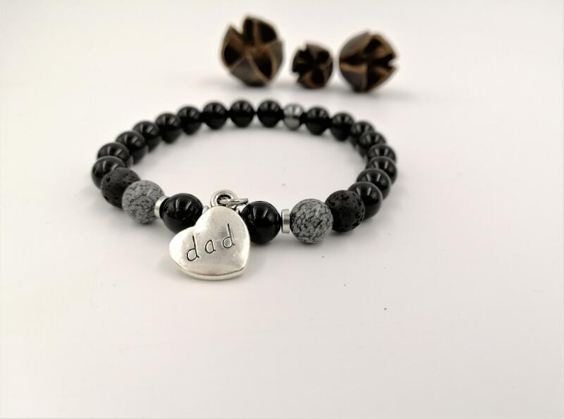 Férfias ásványkarkötő ónix és lávakő ásványokból készült "Dad" (Apa) felirattal.