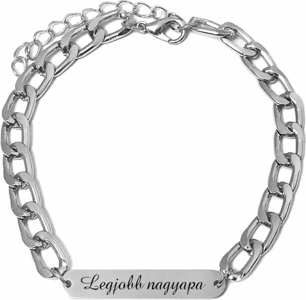 Paraméterek: – A vékonyabb karlánc: A szemek 4x3 mm-esek, vékony, elegáns, diszkrét (de azért nem a legvékonyabb karlánc). A karlánc anyaga rozsdamentes acél! A felirat lapocska kb. 30x6 mm-es, rozsdamentes tüköracél. – Vastagabb karlánc: A szemek kb. 9x7 mm-esek, nem nagyon vastag, nem is vékony. A karlánc anyaga rozsdamentes alumínium. A felirat lapocska kb. 30x6 mm-es, roz