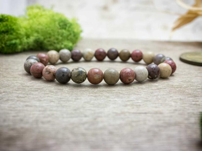 Jáspis ásvány karkötő. Az ásvány golyók gumira vannak felfűzve. Amit a jáspisról érdemes tudnod: Gyakori előfordulása és a földszínek széles skálája miatt a jáspist ősidők óta használják dísztárgyak és pecsétek készítésére. Mágikus ereje miatt is nagyra értékelték. Úgy hitték, hogy túlvilági szellemi cselszövések ellen véd és a szerelmi bánatot mérs