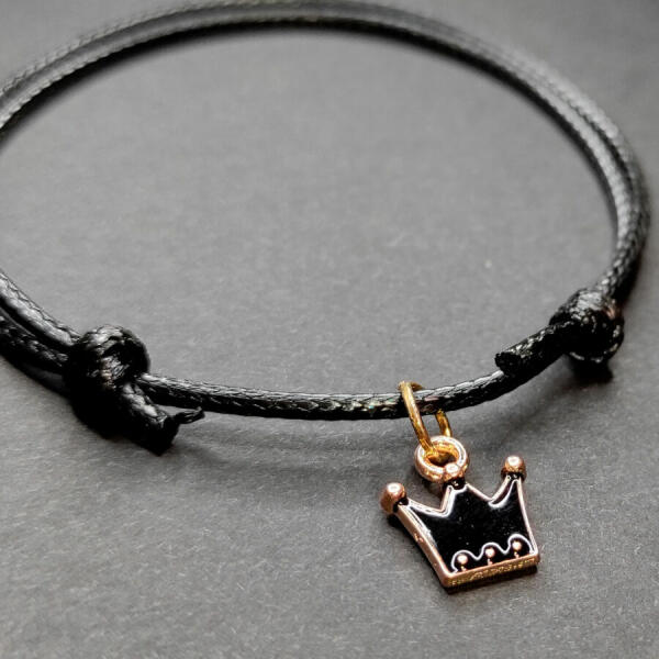 Fekete zsinórszövet karkötő fekete tűzzománc korona charmmal Paraméterek:. Charm mérete kb. 1,2 cm. Charm anyaga fémötvözet. Karkötő anyaga textil.