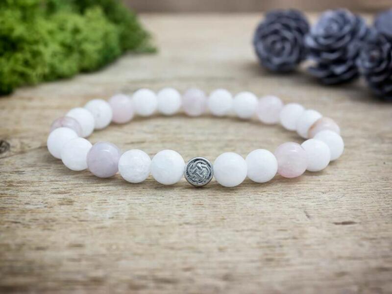 8 mm-es tejkvarc és rózsakvarc ásvány gyöngyökből fűzött gumis karkötő. Az ékszer dísze egy kelta szimbólumos medál. A kelta csomó az univerzális szeretettel kapcsol össze minket. A kelta csomó, melynek nincs se kezdete, se vége, ezzel utal az örökké tartó szerelemre és a mindent átfogó szeretetre. Az amulett rendkívül pozitív energiákkal rendelkezik. Hatása: Visel
