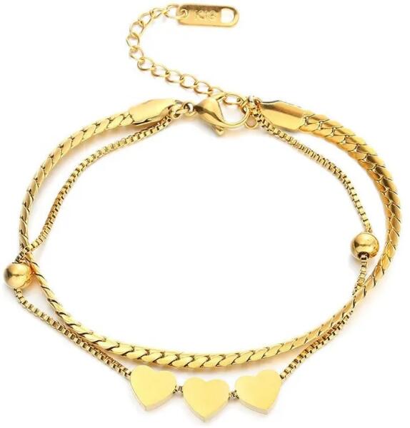 Bernica Karkötő Szépséges, divatos, nőiesen finom Bernica karkötő verhetetlen áron. Szívecske medálokkal díszített. Az ékszer nem tartalmaz nikkelt, ezért érzékeny bőrű emberek is viselhetik. Tulajdonságok: A karkötő hossza: 14cm + 4cm Díszítése: Szívecskék Anyaga: Nemesacél Szín: Arany