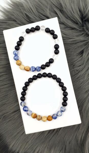 Gyönyörű egyedi karkötőpár fekete ónix, hegyikristály, szodalit és képjáspis ásványokból készítve. Ezen ásványok kombinációja védi és erősíti a kapcsolatot. Segít megtartani a boldogságot és a kiegyensúlyozott szexuális életet. Ónix hatása: energia, védő, stabilitás, kitartás, stresszoldó Jáspis hatása: védő, emésztőrendszer, ivarszervek, vérkeringés, s