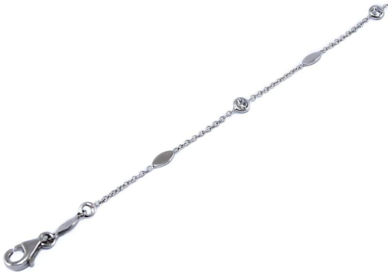 Különleges és kedvelt fazonú, vékony anker típusú, ródiummal bevont arany karkötő, köves és csónak alakú fényes betétekkel kombinálva.