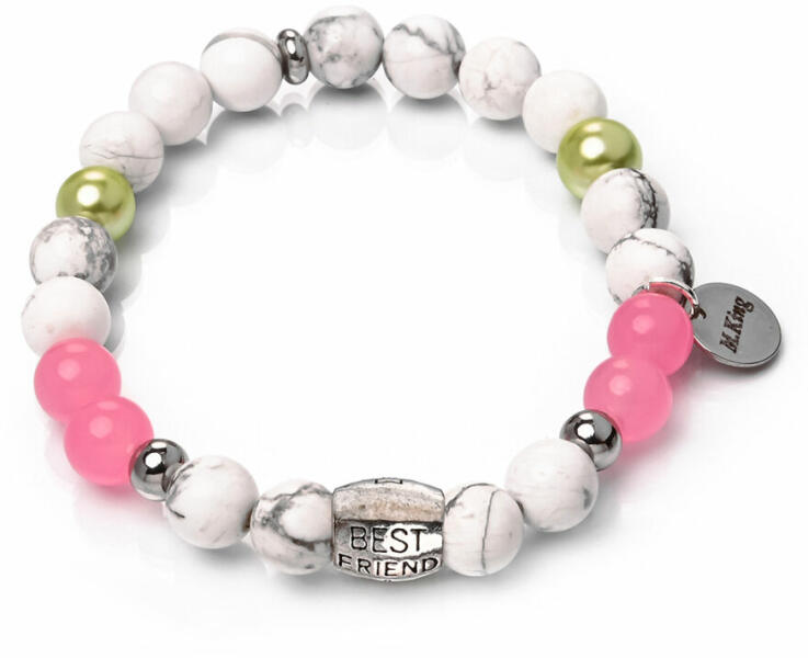 Jade, szintetikus kagyló és howlit karkötő, elegáns fehér és pink, Legjobb Barátok dísszel. A Maria King kollekció kiemelkedő darabja, egyszerűségében különleges ásvány karkötő a legfontosabb üzenettel: mennyire fontosak a barátok. Figyelem! A képen exkluzív kivitelű, rugalmas karkötő látható kapocs nélkül, de kérheted extra erős acélsodronyra is delfinkapoccsal