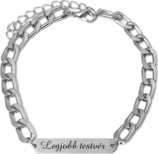 Paraméterek: – A vékonyabb karlánc: A szemek 4x3 mm-esek, vékony, elegáns, diszkrét (de azért nem a legvékonyabb karlánc). A karlánc anyaga rozsdamentes acél! A felirat lapocska kb. 30x6 mm-es, rozsdamentes tüköracél. – Vastagabb karlánc: A szemek kb. 9x7 mm-esek, nem nagyon vastag, nem is vékony. A karlánc anyaga rozsdamentes alumínium. A felirat lapocska kb. 30x6 mm-es, roz