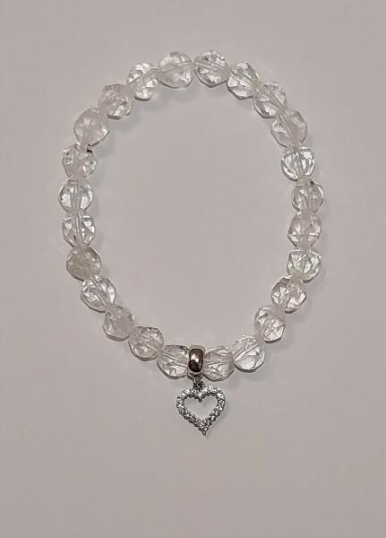 Kristálytiszta ragyogás női karkötő Igényesen megmunkált Hegyikristály ásványkőből készült női karkötő nemesacél, mikrostrasszal kirakott, szív alakú medállal. Az ékszer a letisztult elegancia jegyeit viseli. Gyöngyök mérete: különleges csiszolású kb. 6 mm-es ásványgyöngyök Rugalmas, gumis ékszerdamil alapra készült A Hegyikristály a 12 mesterkristály egyike.