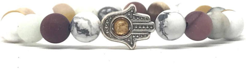 Egyedi ásvány karkötő Hamsa-védelmező kéz dísszel A 8mm-es Mokait, Amazonit és Howlit ásvány golyókból készült karkötő speciális gumis damilra van fűzve, Hamsa kéz díszítéssel. Amit a Howlit ásványról tudni kell: A howlitot Henry How-ról, egy 19-ik századi ásványkutatóról nevezték el, aki elsőkét talált rá erre a sokoldalú kőre. A howlit festetlenül matt feh