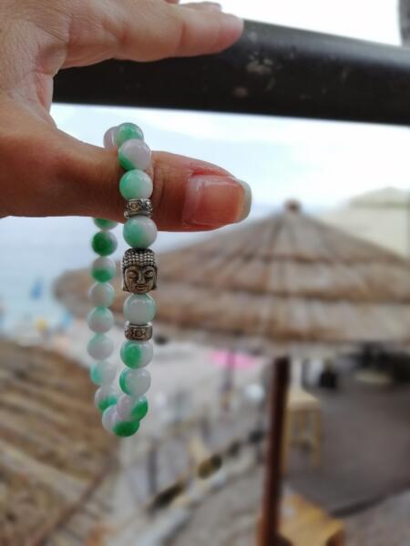 Gyönyörű csiszolt, 8 mm átmérőjű Buddha fej jáde ásványkarkötő.