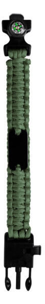 Többfunkciós túlélési karkötő iránytűvel, síppal és kovaköves tűzgyújtóval.