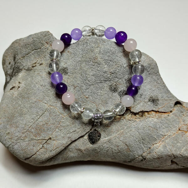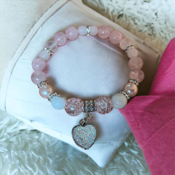 Csodaszép szív alakú strasszos medállal díszítettük ezt a rózsakvarcból, hegyikristályból készült ásványgyöngyös karkötőt. Rendkívül mutatós, egyszerű, mégis elegáns ékszer. Ajánljuk mindenkinek, aki szereti a szépet. Remek ajándékötlet Anyának, Tesónak, Nagyinak, barátnőnek, vagy akár saját magunknak is. Anyák napjára is nagyszerű választás, garantáltan