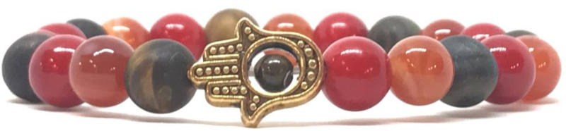 Egyedi ásvány karkötő Hamsa-védelmező kéz dísszel A 8mm-es Tigrisszem, Karneol és Jáde ásvány golyókbók készült karkötők speciális gumis damilra vannak fűzve, Hamsa kéz köztes díszítéssel. Amit a Karneolról tudni kell: Színe a narancssárgától a sötét-barnás pirosig terjedhet. Nevét a narancsos-piros Kornel (Kornél) cseresznyéről kapta. A Karneol testi és lelki