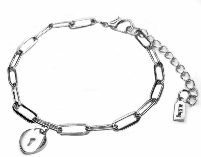 Szív Lakat charmos karkötő, ezüst színű. Paraméterek: Charm mérete 1,2 cm. Anyaga nemesacél, karkötő anyaga rozsdamentes acél. Karkötő mérete 17+5 cm. (Ha ettől eltérő méretet szeretnél, rendeléskor a MEGJEGYZÉSBE írd be. )