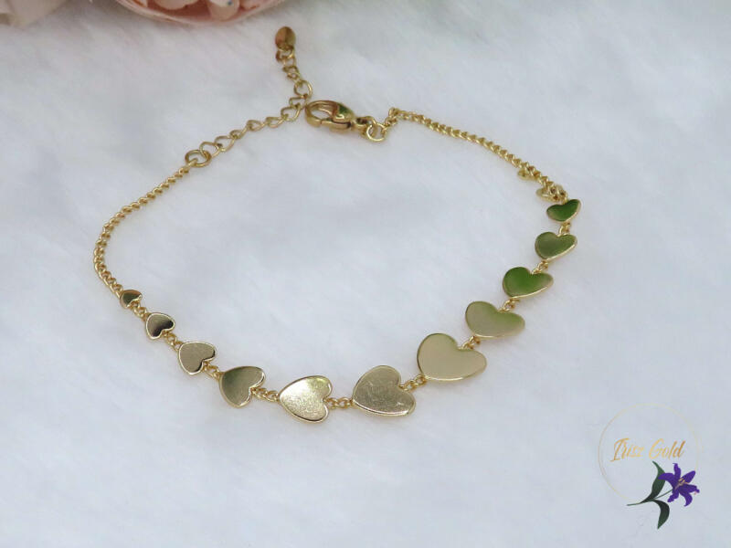 Gold Filled szivacskés karlánc kő nélkül Szin: 18K Méret: 17+3cm /10-3mm -ig 13 db kisebb -nagyobb szívek a karlánc dísze A forgalmazott divatékszerek alapanyaga nikkel és ólommentes ezért többnyire nem okoznak allergiás tüneteket, nyugodtan hordhatják fémérzékeny emberek is. Általában nem színezik a bőrt és más divatékszerekhez képest nagyságrendekkel jobb kopásáll