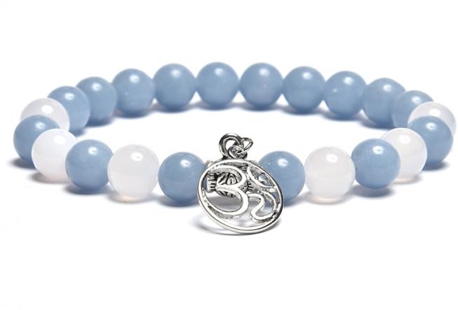 Az angelit és a fehér achát 8 mm-es ásvány gömbjeiből készített karkötő, gumira fűzve. A díszító elem : 1 db antiallergén Om medállal. A karkötő méretének meghatározása : a csuklód méretéhez adj hozzá 1,5 cm-t. Az ásványok nem helyettesítik az orvosi diagnózist és kezelést. Az angelit hatása : a New age irányzat szerint a tudat egyik köve az angelit, amely a tes