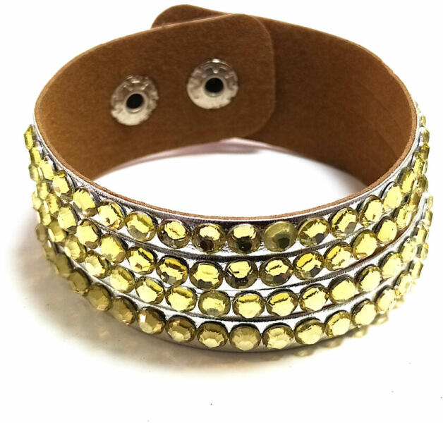 Műbőr, többsoros, szegecses állítható karkötő, metálezüst szíj, sárga kövekkel. Manapság nagyon divatos a szegecs és strassz, ennek a műbőr karkötőnek ad egy kis játékosságot a több sorban körberakott szegecs. Divatos, trendi, és nagyon kedvező áron a tiéd lehet. (A második-harmadik képen a termék formája jobban látható, de a színe az első kép szerint ezüst sz